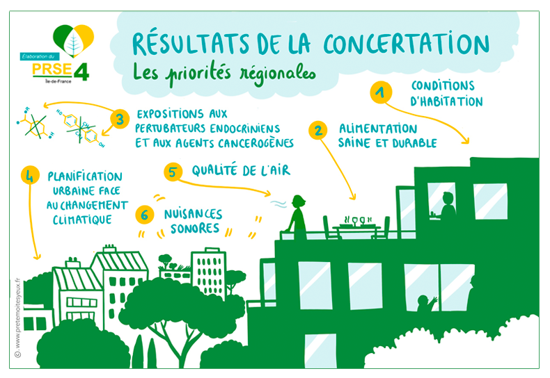 Journée organisée par le Plan Régional Santé Environnement d'Île-de-France. La journée est divisée en deux partie : facilitation graphique à la tablette retransmise en direct sur écran le matin, et reportage l'après-midi. Je vous présence ici une des fresques réalisées dans la matinée. Voir le projet complet.