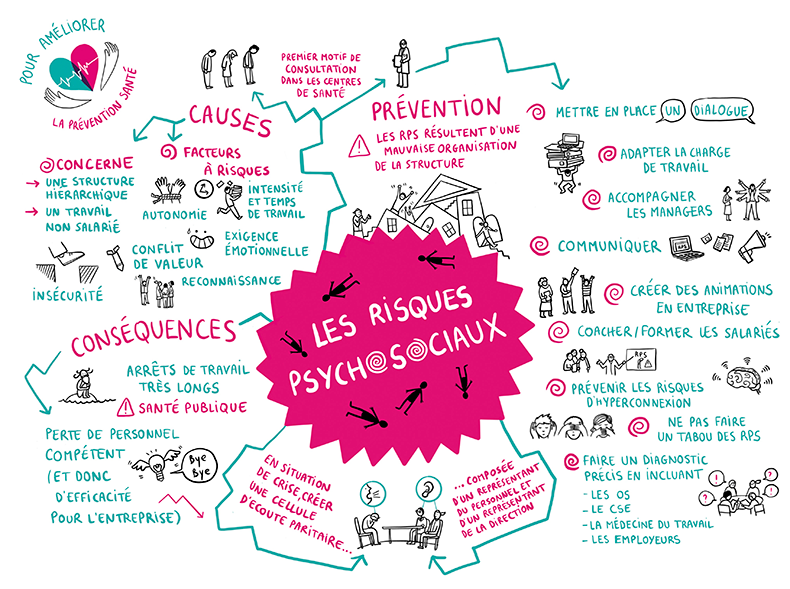Série de facilitations graphiques, synthèses dessinées relatives aux ateliers consultatif organisés par le groupe AÉSIO au sujet de la prévention santé en entreprise. Ici, une des trois fresques réalisées. Voir les autres fresques.