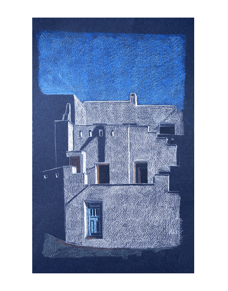 Il a une petite maison dans le village de Glinado. Ce puzzle de murs blancs est la première chose qu'il voit