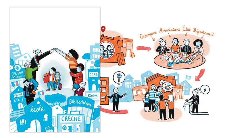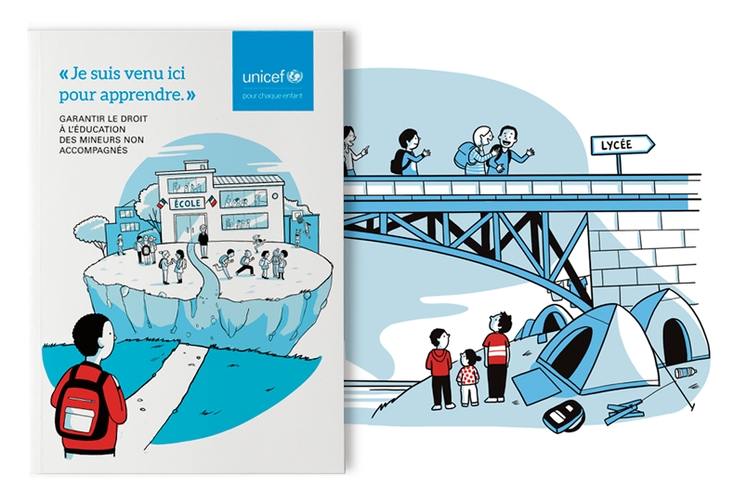 Série d'illustrations réalisées dans le cadre d'une publication commandée par UNICEF. Le livret final s'adresse aux communes et recense les leviers pour lutter contre l'exclusion des enfants sans domicile en France.