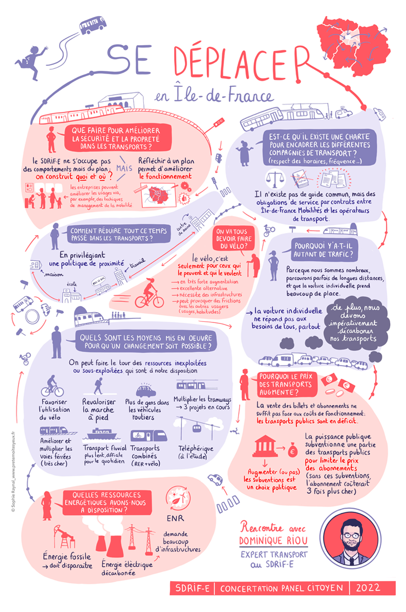 Dans le cadre d'un panel citoyen organisé par le "Schéma directeur d'Île-de-France", exemple de synthèse graphique relatant les échanges entre un expert et des habitants d'Île-de-France. Cette synthèse fait partie d'un travail plus large, englobant 4 synthèses grahiques, trois jours de reportage avec 100 portraits et verbatims, et de la facilitation graphique pendant les ateliers.
