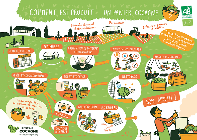 Travail réalisé pour l'association Cocagne. Les fresques ont été co-construites avec les équipes sous forme de facilitation graphiques lors de réunions de présentation. Voir toute la série de fresques.