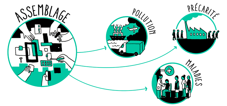 Série d'illustrations web, de fresque et de gif animés réalisés avec Egraine expliquant l'impact de la production, de la distribution et de l'utilisation du téléphone sur l'environnement. Voir les illustrations.