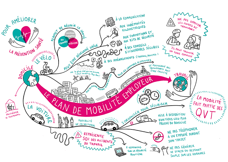 Série de facilitations graphiques, synthèses dessinées relatives aux ateliers consultatif organisés par le groupe AÉSIO au sujet de la prévention santé en entreprise. Ici, une des trois fresques réalisées. Voir les autres fresques.