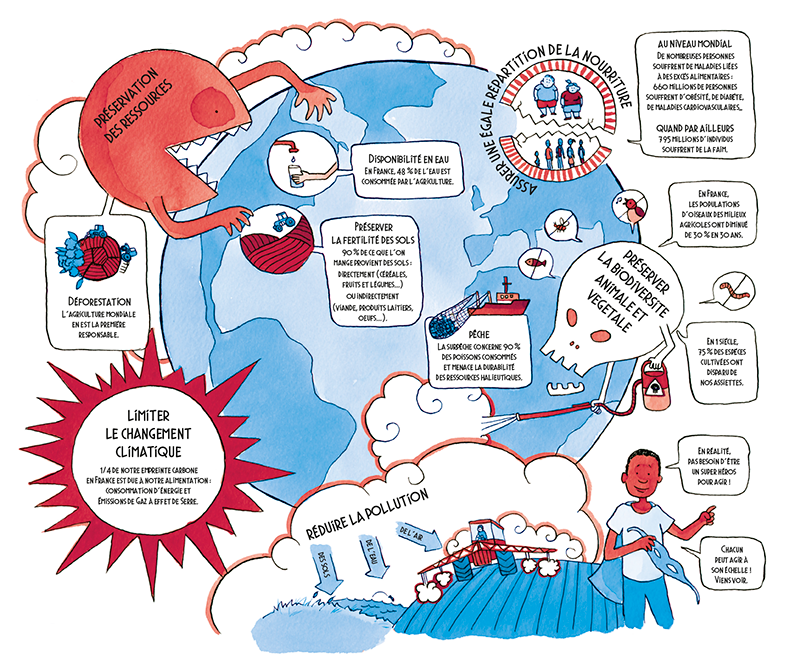 Réalisation de quatre frises, destinées aux lycéens, expliquant les conséquences de notre alimentaion sur l'environnement.