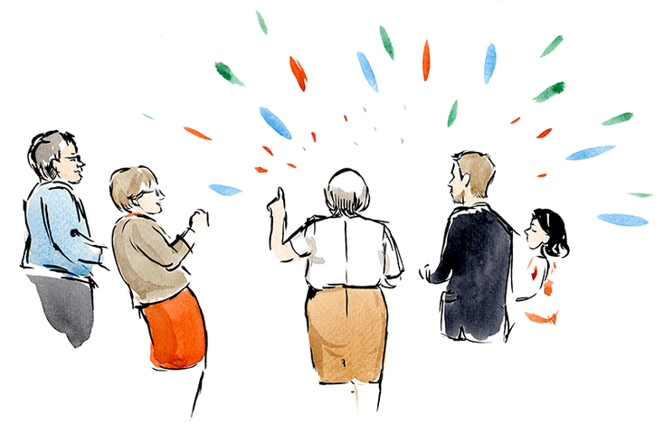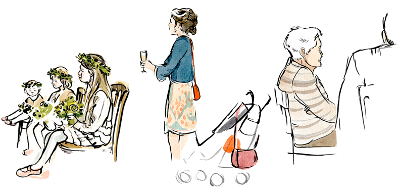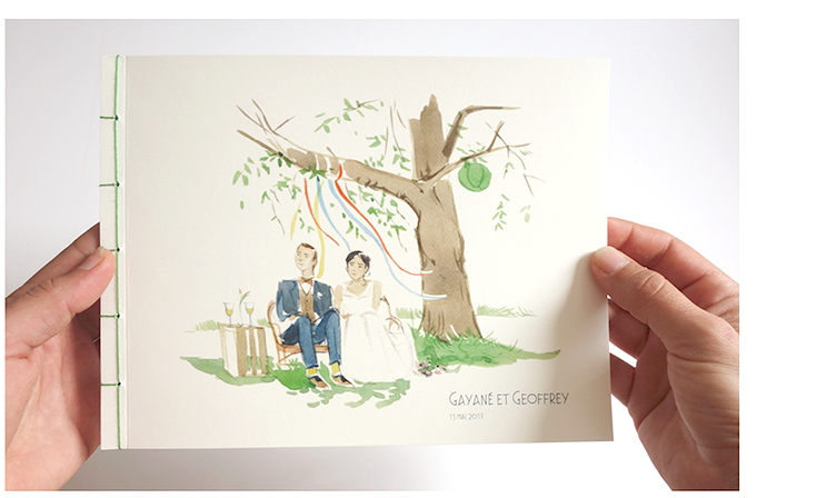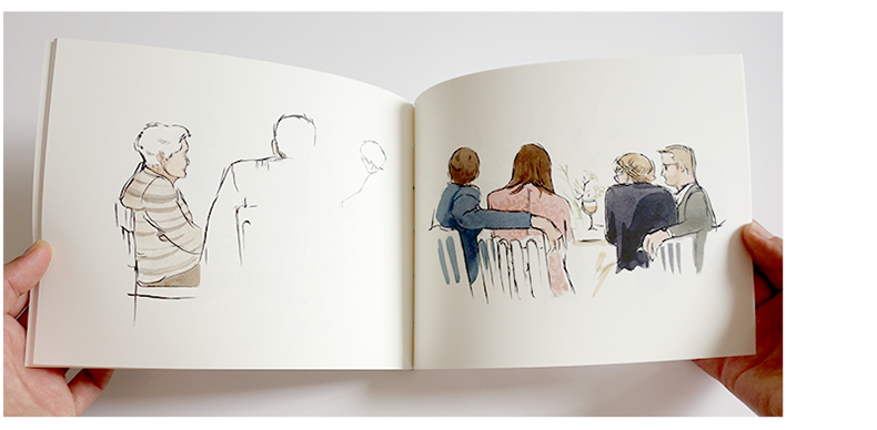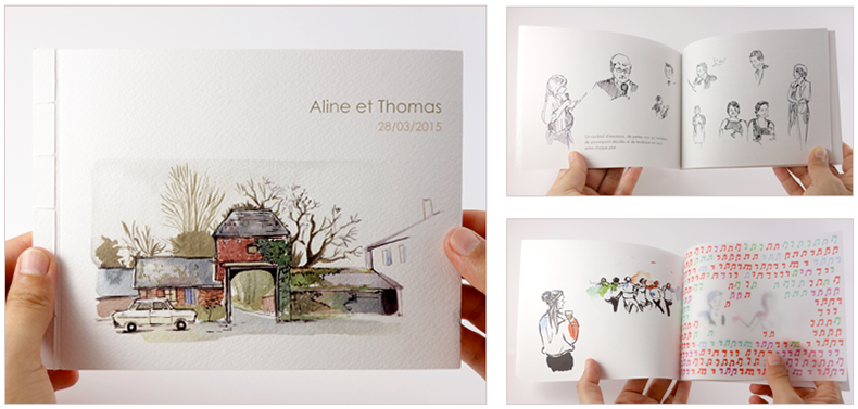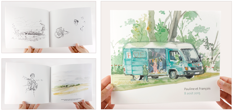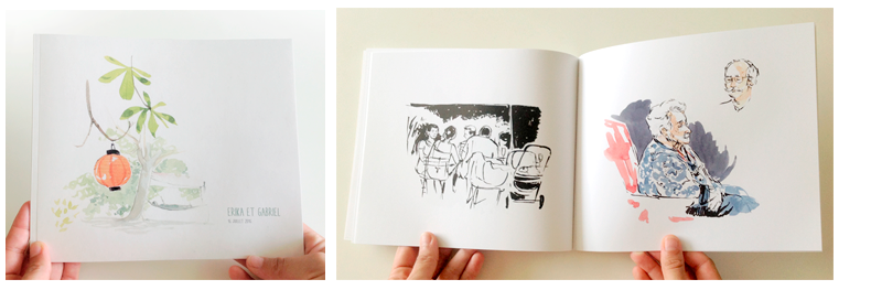 Toute la journée, je dessine sur le vif l’ambiance des différentes étapes du mariage (préparation, cérémonie, coktail, repas, fête). Les croquis sont ensuite scannés, mis en page et imprimés dans un livre relié.