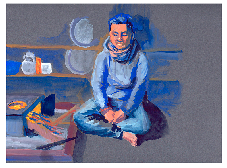À présent, il peint des thangka dans un atelier collectif de Katmandou.