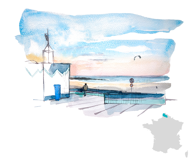 The Manche, to be more precise. We walk on a huge flat beach, bright, beaten by the wind. In the sky,