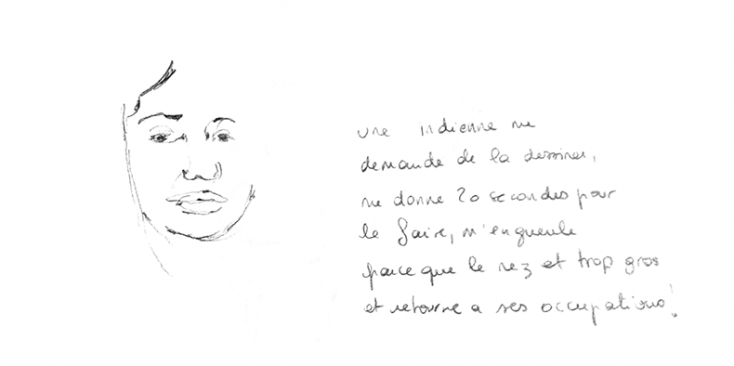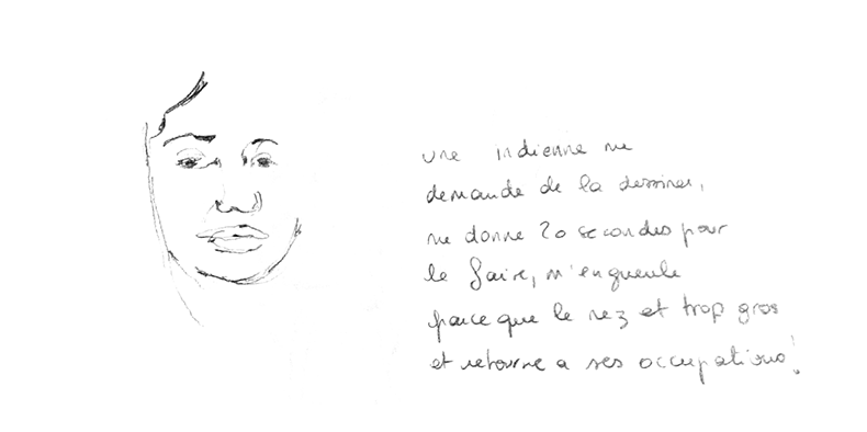 A woman ask me to do her portrait, give me 20 seconds to do it, bawls me because her nose is to big, and goes back to her business.