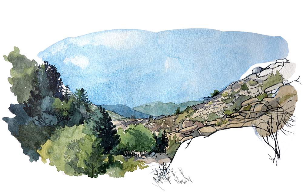 Protected by the shadow of the trees, the Mazanares river crosses a stone crumble.